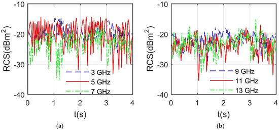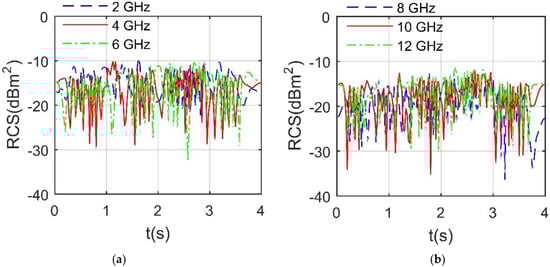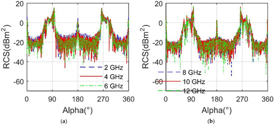 As shown in Figure 8a, the peak value of RCS curve at 2 GHz is higher than that of the other two curves, where the RCS curve at 2 GHz varies from −23.09 dBm2 to −9.224 dBm2. The maximum value of RCS curve at 4 GHz is −10.1355 dBm2, that of RCS curve at 6 GHz is −10.0856 dBm2. This shows that in the current observation angle and frequency range, with the increase of frequency, the mean value of RCS curve first decreases and then increases, while the peak value decreases continuously. Noting that the RCS mean at 4 GHz is −15.291 dBm2, that at 6 GHz is −14.6661 dBm2. For the RCS at 8 GHz as in Figure 8b, the mean RCS is −17.9824 dBm2, the peak is −12.3056 dBm2. As the frequency of the incident wave increases to 12 GHz, the mean and peak of the RCS curve at that observation angle increase gradually, where the mean of the RCS curve at 10 GHz is −16.8794 dBm2, that of the RCS curve at 12 GHz is −16.1253 dBm2. When the radar wave frequency is 12 GHz, the maximum value of RCS curve reaches −11.3846 dBm2 and the minimum is −30.4 dBm2. In addition, the shape and fluctuation of RCS curve change with the increase of frequency. These results show that under the current observation conditions, the increase of incident wave frequency will change the mean and peak level of RCS curve.