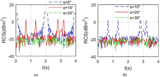 RCS of the flapping wing aircraft, mode M1, Ak1 = Ck1 = π/10, ωk1 = ωk2 = 3.1416 rad/s, Bk1 = Bk2 = −π/2, θup = −θdown = 20°, Ak2 = Ck2 = π/12, frh = 7 GHz. (a) RCS at α = 0°. (b) RCS at α = 20°.