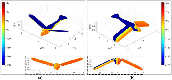 Figure 11 shows that under the given M1 mode, the electromagnetic scattering characteristics of the wing surface change obviously with the flapping of the wing. For the case at α = 10° and t = 0.5 s, the flapping angle of the wing 1 is 18°, where the pitch angle of the wing is 20°. Because the electromagnetic wave is incident from the front and bottom direction of the wing, the leading edge of the wing presents a small number of yellow areas. The upper surface of the wing and the top area of the tail are dark blue, where a small amount of yellow and orange inclusions is distributed on the side of the body. There are many orange-red areas in the head of the body, and some edge and transition areas are yellow. The lower surface of wing 1 is orange red, while the lower surface of wing 2 is orange. For the case at α = 20° and t = 2.8 s, the flapping angle of the wing 1 is 27.1353°, the pitch angle of the wing is −20°. Since the absolute value of the pitch angle of the wing is greater than the elevation angle, all the upper surfaces of the wing 1 are illuminated. In addition to the effect of increasing azimuth, the leading edge of the upper surface of wing 2 and its adjacent half of the upper surface are illuminated. The dark blue area on the top of the body is enlarged, and the color depth of the red area on the side of the nose is slightly deepened. Since the wing is flapping downward, the scattering characteristics of the upper surface of wing 1 are strong. From the leading edge of wing 1 to the middle of wing 1, it presents an orange to yellow gradient. These results show that flapping wings will bring changing strong scattering sources to the flapping aircraft.