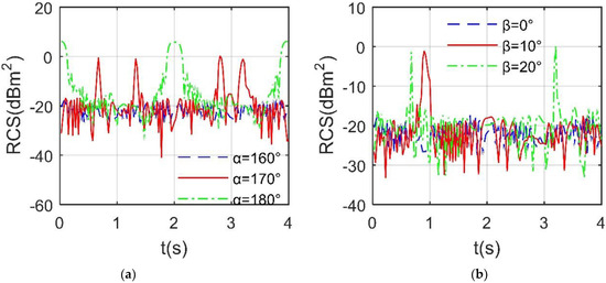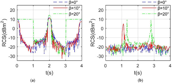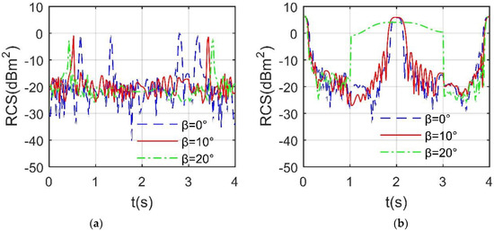 As shown in Figure 16a, under the given observation azimuth, the peak levels of the three RCS curves are similar. The mean RCS of the curve at β = 0° is −12.4488 dBm2, that of the curve at β = 10° is −15.939 dBm2. As the elevation angle increases from 0° to 20°, the peak of RCS curve decreases from 0.2447 dBm2 to −2.0169 dBm2, and the mean value decreases from −12.4488 dBm2 to −17.0115 dBm2. In addition, the RCS curve with β = 0° has four large peaks, while the other two curves have two large peaks. For the Figure 16b, it can be found that the shape of RCS curve changes greatly when β = 20°. Although the peaks of the three RCS curves are around 6.25 dBm2, their mean values are different. The mean of the RCS curve at β = 0° is −3.3248 dBm2, that of the curve at β = 10° is −2.8461 dBm2, where the fluctuation range and trend of the two RCS curves are similar. When β = 20°, the RCS curve has a wide range of values higher than 1.025 dBm2 in the middle period, because at this time, the two U-shaped wings are flapping downward, and the trailing edge of the wing has been providing a large scattering contribution. These results show that in the positive tail direction (α = 180°), the increase of lift angle is unfavorable to the peak and mean of the dynamic RCS curve of the flapping wing aircraft.