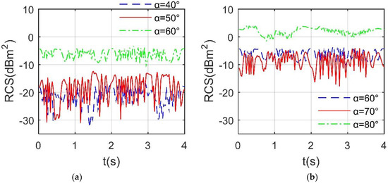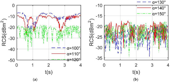 As presented in Figure 14a, the shapes and peaks of the three RCS curves are different, where the peak of the curve at α = 100° is −6.4955 dBm2, that of the curve at α = 120° is −17.6693 dBm2. The mean value and fluctuation range of the two RCS curves with α = 100° and α = 110° are similar, where the mean of the former curve is −9.5172 dBm2, that of the later curve is −11.7566 dBm2. As the azimuth increases from 100° to 120°, the mean and peak of RCS curve show a decreasing trend, because the trailing edge of the wing and its adjacent surface become the main dynamic scattering source. Note that the trailing edge of the wing has thinner geometric features than the leading edge and outer end, resulting in lower scattering contribution. For the Figure 14b, it can be seen that the fluctuation ranges of the three RCS curves are similar. As the azimuth increases from 130° to 150°, the mean and peak value of RCS curve first increases and then decreases, where the mean of the curve at α = 130° is −23.0354 dBm2, that of the curve at α = 150° is −21.8895 dBm2. These results show that for the lateral backward azimuth, the mean value of the dynamic RCS curve of the flapping wing aircraft generally decreases with the approach of the incident wave to the tail.
