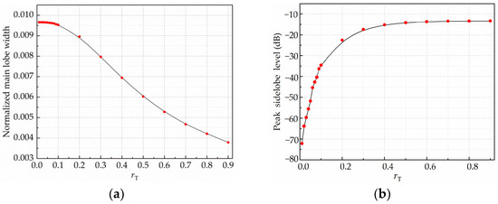 (a) Relationship between normalized main-lobe width and rT; (b) relationship between peak sidelobe level and rT.