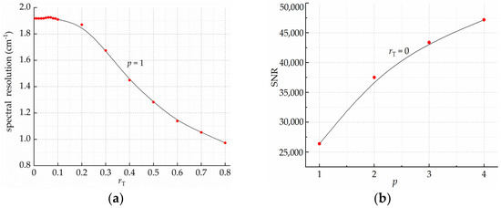 (a) Trend plots of spectral resolution as a function of rT; (b) trend plots of spectral SNR as a function of p.