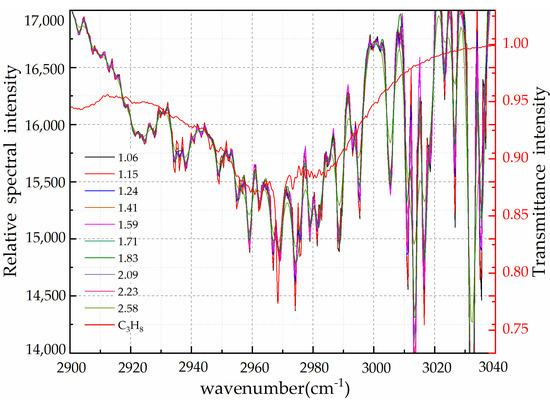 The concentration inversion band of C3H8 gas was set at 2900–3040 cm−1. The FWHM of its standard absorbance spectrum (from the QASOFT infrared standard database) was about 32 cm−1. The comparison between the spectra of C3H8 with different apodization degrees and the C3H8 standard absorbance spectrum is shown in Figure 6. Figure 6 shows that the C3H8 spectrum had a broad FWHM with no sharp absorption peaks, and the higher the apodization degree was, the smoother the spectral curve was. The detailed changes in the spectrum with small apodization degrees were consistent, and spectral absorption was a little weaker when the apodization degree was high. When the apodization degree was 2.58, the details of the C3H8 absorption spectra were distinctly different, but the change trends were consistent.