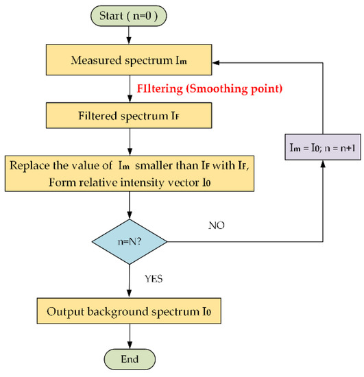 The specific calculation process is as follows: first, filter the measured spectrum Im; second, compare the relative spectral intensity IF obtained after filtering with the corresponding spectral intensity Im before filtering one by one; third, replace the value of Im smaller than IF with IF to construct a new relative intensity vector I0; and fourth, repeat the above process for I0 until the cycle stops to obtain the background spectrum I0. The process is shown in Figure 8.