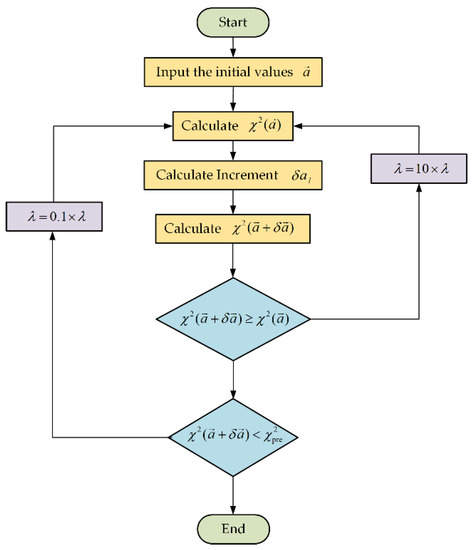 For a set of fitting parameters with given initial values, the iterative process based on the Marquardt nonlinear least squares method is shown in Figure 9, where λ is the step length and is the convergence value.