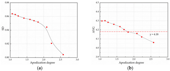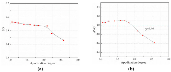 Figure 10a depicts the relationship between different apodization degrees and the precision of the C3H8 concentration inversion. It shows that with the improvement of the apodization degree, the spectral SNR and the precision of propane concentration inversion were improved. When the AD was 2.58, the SD was the smallest, and it was only 0.804, meaning the precision was the highest. Figure 10b depicts the relationship between the different apodization degrees and the AVG of the C3H8 concentration inversion. It shows that when the apodization degree increased, the RE of the C3H8 concentration inversion was within 3%, which was stable, but the value had an obvious downward trend. For the C3H8 gas concentration inversion, when the apodization degree was increased from 1.06 to 2.58, the precision was improved by 6.94%, and the correctness was unchanged.