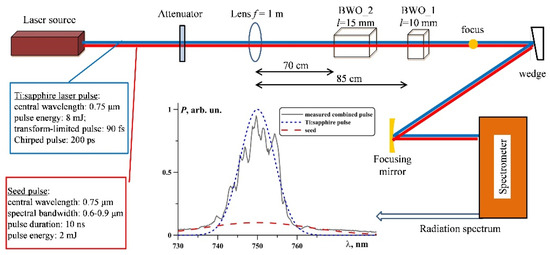 Behind the BWO crystals, the laser beam was focused in air; the divergent laser beam after the focus was attenuated with a couple of wedge plates (indicated as a single wedge in Figure 1 for simplicity) and focused into an ASP-480 spectrometer (Avesta Project Ltd., Moscow, Russia) with a spherical mirror. It should be noted that the focusing in air did not cause any nonlinear effects because the laser pulse power of 40 MW (8 mJ/0.2 ns) was significantly lower than the self-focusing critical power of 2.4 GW. It was verified in the experiment by removing the BWO crystals.