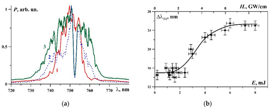 The spectrum of the initial pulse had a central wavelength of 0.75 µm, with the spectral bandwidths being between ~10 nm and ~15 nm at the ½ and 1/e levels, respectively (see line 1 in Figure 2a). After passing through the first BWO crystal, the spectrum of the laser pulse (at 8 mJ energy) was deformed and slightly broadened (line 2 in Figure 2a). The spectral broadening after passing through the two BWO samples became more pronounced and stronger (line 3 in Figure 2a).