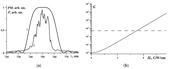 The calculated gain ratio, G, due to FWM versus the IL parameter is presented in Figure 3b. The dashed horizontal line in Figure 3b indicates the required gain level corresponding to the power ratio of the seed and pump pulses. The calculations showed that the required gain, G, of 5 × 102 was achieved at IL ~ 7 GW/cm, which was in adequate agreement with the experimental observation (Figure 2b). It should be noted that the intensity–length product in the experiment could have been 10–15% higher, since we did not take into consideration the convergence of the focused laser beam. However, even if it does take place, the calculation indicated that the FWM gain would be quite sufficient for pulse spectral broadening. Thus, the coincidence of both the calculated phase-matching bandwidth and gain ratio G with the experimental results provides convincing confirmation that the origin of the spectral broadening of chirped laser pulses in BWO crystals is just related to FWM.
