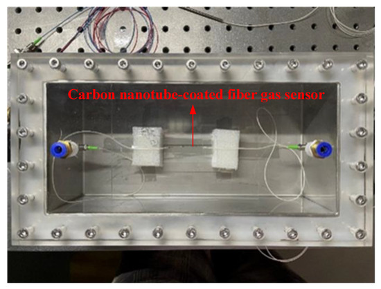 In the experiment, a carbon nanotube fiber sensor was prepared by using a single-mode fiber. The cladding and coating of the single-mode fiber were stripped off to obtain the bare fiber, which was preheated with a butane flame. At the same time, both ends of the fiber were pulled to make the coating area steady, and continuously heated for 4 s. Then, the tapered optical fiber was moved to a clean glass slide to fix it, and a water dispersion solution of 0.15 wt% carboxylated high-purity single-walled carbon nanotubes was applied to the glass slide substrate. The optical fiber was baked in a constant temperature oven at 75 °C for 40 min, and, finally, the coated optical fiber was taken out and put into a closed air chamber as a fiber gas sensor. The gas detection cell is shown in Figure 1.