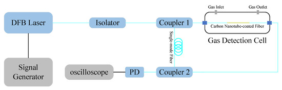 The FLRD system was used for the gas detection experiment. The FLRD system realized signal demodulation by establishing the relationship between the ring-down time and the optical loss of the fiber sensor, which was not easily affected by the fluctuation of the light source, and was suitable for various types of optical fiber sensors. The FLRD system built in this paper is shown in Figure 2. The system consisted of a function signal generator, a laser source, an isolator, two 1 × 2 fiber couplers, a gas detection cell with the carbon nanotube-coated fiber gas sensor, a photodetector (PD), an oscilloscope, etc.