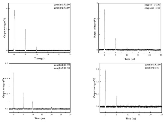 The detection result obtained by the FLRD system was a series of attenuated pulse waveforms, and the selection of the coupler split ratio would affect the optical loss of the system, which would affect the number of pulses, and the number of pulses relates to the accuracy of curve fitting. Therefore, it was necessary to determine the optimal coupler split ratio of the FLRD system.
