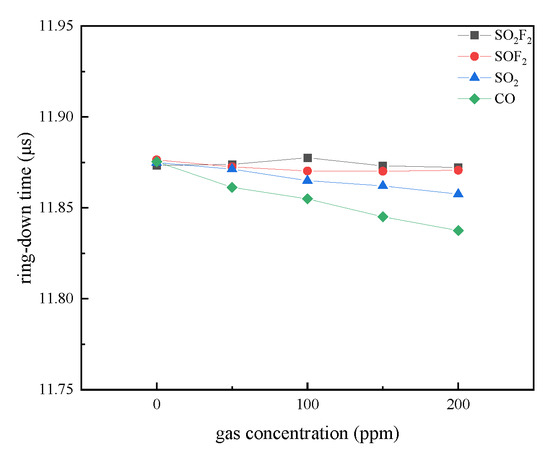 The experimental results are shown in Figure 4. Compared with the other gases, the linear law between CO and ring-down time was stronger. The change of the concentration of SO2F2 and SOF2 basically did not cause the change in the ring-down time. For SO2, there was a linear law between the concentration and the ring-down time, but the change of the ring-down time was not as obvious as that of CO detection.
