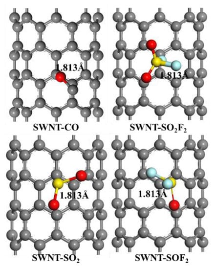 From the above experimental results, combined with the existing research [18], when the nanomaterial adsorbed gas, its dielectric constant would change, which would lead to change in the refractive index of the material and change in the optical loss of the sensor. That is to say, the gas detection capability of the coated fiber gas sensor was related to the adsorption characteristics between nanomaterials and gases. Therefore, based on the density functional theory, the theoretical analysis of the adsorption characteristics between carbon nanotubes and four kinds of gases was carried out, and the above experimental phenomena explained.