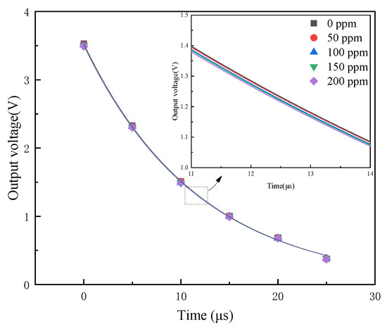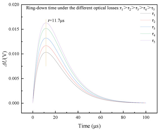 In the equation, ΔU represents the voltage difference, and Ub and τb represent the voltage value and the ring-down time of the ring-down curve under the background gas. The values Un and τn represent the voltage value and the ring-down time of the ring-down curve under the different optical losses of the sensor. Let n be 1, 2, 3, 4, 5, τ1 > τ2 > τ3 > τ4 > τ5. Then, the curve of the voltage difference between the background gas ring-down curve and the ring-down curve under the different optical losses could be obtained, as shown in Figure 10. It can be seen that when the time t was 11.7 μs, the voltage difference had the largest variation. Therefore, the pulse signal closest to the time value was the pulse signal with the largest voltage signal change, due to the change of optical loss, which could be used as the pulse signal for judging the detection limit.