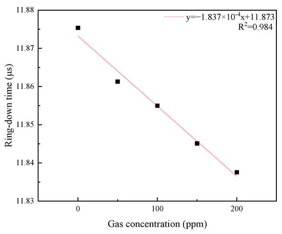 According to the fitting results of the exponential function, the ring-down time corresponding to different concentrations of CO was obtained, and the linear fitting between the concentration and the ring-down time was performed by the least squares method, as shown in Figure 8. It can be seen that there was a good linear relationship between the ring-down time and the gas concentration, with R2 being 0.984.