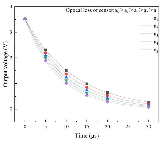 The number of optical pulses in the original pulse signal was generally 5 to 9, and the pulse signal with the most obvious pulse amplitude change with concentration change selected as the optical pulse signal for judging the detection limit. In the ring-down curves of different sensor optical losses, the voltage signal changed most obviously in the middle time period. Figure 9 shows the simulation results of the ring-down curve of the FLRD system under the different sensor optical losses. Assuming that the optical losses corresponding to the different ring-down curves were a5 > a4 > a3 > a2 > a1, it could be seen that when the time was between 5~20 μs, with the increase of the loss, and the voltage value changed more obviously.