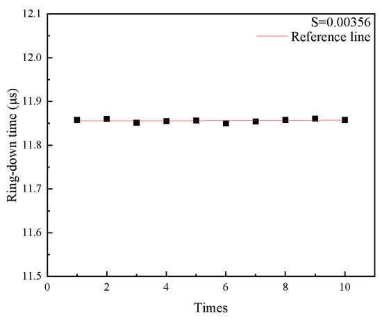 The repeatability of single-point measurement refers to the degree of difference between repeated measurements of the same measure and under the same working conditions, expressed as the relative standard deviation of multiple measurements. CO gas with a concentration of 100 ppm was introduced into the gas detection cell, and the value recorded after the gas concentration in the gas detection cell stabilized. The ring-down time was calculated and the result is shown in Figure 11. The standard deviation of single-point repeatability was 0.00356, indicating that the detection system had good single-point repeatability.