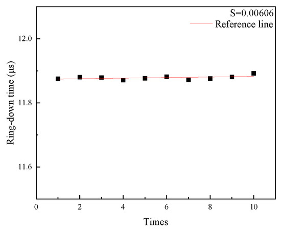 Stability refers to the ability of the detection system to remain constant for a specified period when its performance remains constant under specified working conditions. In the stability experiment, CO gas with a concentration of 100 ppm was introduced into the gas detection cell. After it stabilized, the value was recorded every 5 min and its ring-down time calculated. The results are shown in Figure 12. It can be seen that after a long period of experiment, the ring-down time fluctuated slightly, and the standard deviation was 0.00606. Therefore, the detection system had good stability.