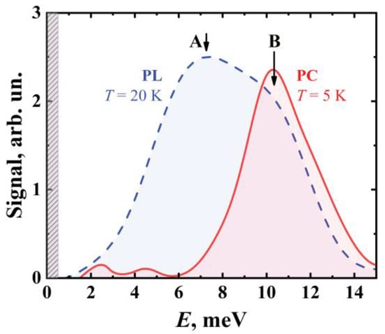 Figure 1 shows the PL and PC spectra of the bulk Hg0.78Cd0.22Te epitaxial layer in the THz domain. The bandgap of the structure is about 85 meV; therefore, the interband PL line is not shown and the PL spectrum is related to the vacancies. Figure 1 confirms that the PL spectrum drops at low quanta energies due to extremely fast non-radiative transitions to the shallow vacancy states, as discussed above. The PL spectrum has two maxima corresponding to photon energies of about 7.2 meV and 10.4 meV (features A and B). The spectral position of feature B is in positive agreement with the maximum of the PC spectrum of the p-type sample obtained from the same structure upon annealing that increases the concentration of mercury vacancies.