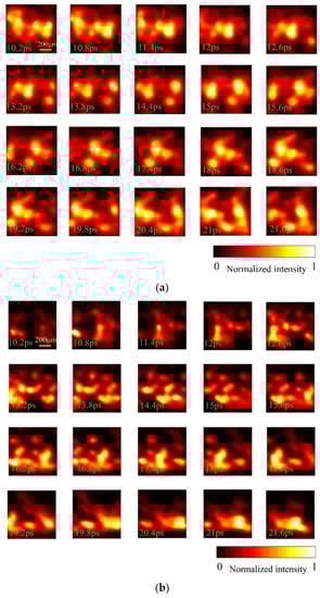 In our experiment, the scanning level of the streak camera is 125 ps [32], so the temporal resolution of the streak camera is about 0.06 ps/pixel. Meanwhile, the shearing velocity of the streak camera is set to mm/ns. Additionally, the internal CCD size of the streak camera is 1024 × 1024 pixels (2 × 2 binning; binned pixel size ). Therefore, the reconstructed frame rate, , is determined by to be fps [22].