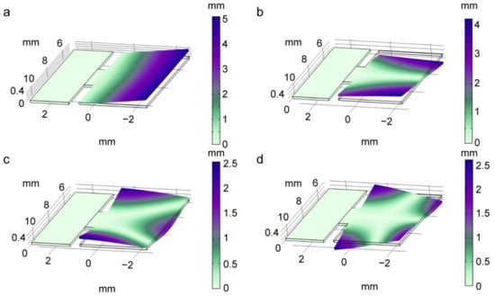 Working modal simulation of the cantilever resonator (Characteristic frequency (a–d): 4153.8 Hz, 6269.7 Hz, 16,041 Hz, 25,167 Hz).