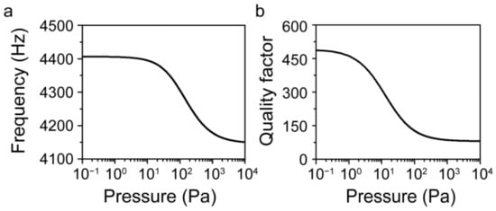 The relationship between the variation of the intrinsic frequency and quality factor with air pressure is thus established, and its curve distribution is shown in Figure 5.