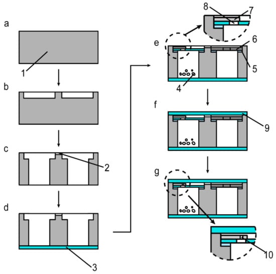 Preparation process of the MEMS microparticle vacuum chamber (1: Silicon wafer, 2: Micro-channels, 3: Lower glass sheet, 4: Vaterite particles; 5: High temperature adhesive; 6: Cantilever resonator; 7: Tinfoil; 8: Small glass sheet with one hole; 9: Upper glass sheet; 10: Micropore in the tinfoil). (a–g) refer to each processing step. See the text for its specific description.