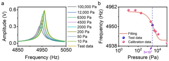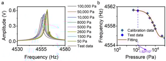Variation of resonant frequency of cantilever with air pressure of microparticle chamber in Chamber I. The test data are obtained through experiments after step (g), and the remaining calibration data are obtained through experiments before step (f). (a) Resonance spectrum; (b) Calibrating plot.