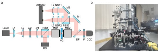 The experimental setup used for the trapping and rotation of a single vaterite particle in the microparticle vacuum chamber. (a) Schematic of the setup (L1–9, Lens; λ/2, Half-wave plate; λ/4, Quarter-wave plate; PBS1–2, Polarizing beam splitter; MO1–2, Microscope objective; VC, Vacuum chamber; DF, Dichroic filters; F, Filters; BD, Beam dump; M1–2, Mirror; NDF1–2, Neutral-density filters); (b) Image of the setup.