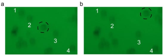 Trapping process of single vaterite particle. (a) Before trapping; (b) After trapping (Particles 1–4 are reference particles).