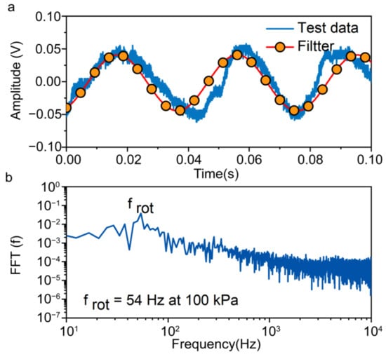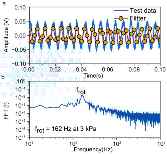Test of rotation signal under a vacuum environment of 3 kPa. (a) Time domain signals; (b) Frequency domain signals.