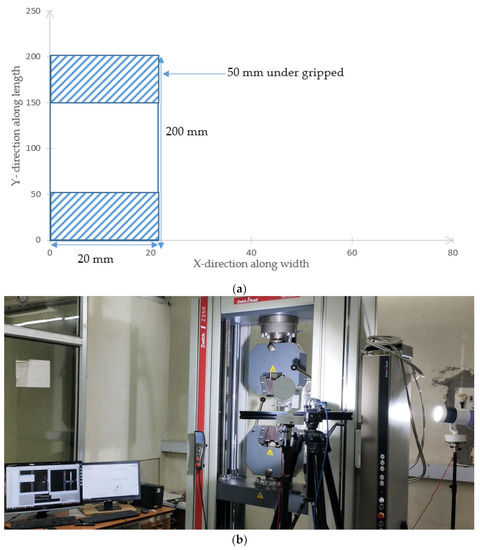 The experiments were performed on a universal testing machine (Zwick Roell 250 with a maximum capacity of 250 kN, as shown in Figure 2b) with homogenous working conditions at room temperature. The strain rate was kept = 1 × 10−3 per second. The material used for the tensile test was SS304 with 1 mm thickness. A series of samples were cut in a 0° rolling direction. Rectangular cross sections with dimension 200 mm × 20 mm × 1 mm were cut out from the steel sheet. While performing the experiments, 50 mm from both ends was constrained, and the remaining mid-section (100 mm in length) was kept under loading conditions. The samples’ length, width, and thickness were measured along the y-axis, the x-axis, and the z-axis, respectively. The load was applied in the y-direction along the length. The tests were conducted for the samples in the rolling direction until three reproducible curves were produced.