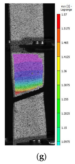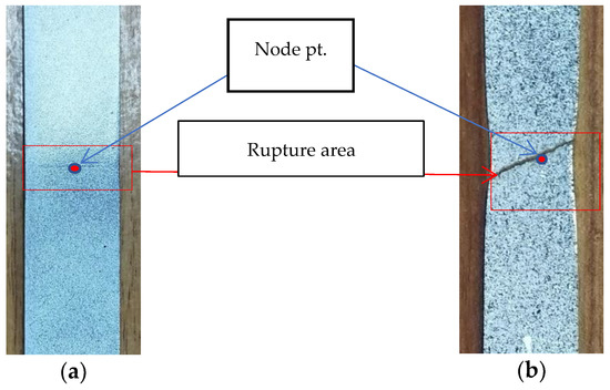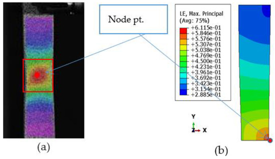 The first validation concerns the displacement invariance of the samples, whereby a speckle pattern was used for verification, as shown in Figure 5. Figure 5a was displaced by 0 and Figure 5b was obtained after rupture. To better conform the actual measurement situation, the load in the experiments was homogenously added to these samples. Subsequently, in the numerical simulation, a node point at the highest strain deformation was uniformly selected in Figure 6a,b, and this node point was matched in the tension test experiment using the DIC device. Since the deformation is known from the true displacement of the generated samples, the true displacement of these node points is known. The performance of the DIC deformation measurement technique was evaluated by the error between the simulated results and the true displacements, as shown in Figure 6. On samples with node points, it can be demonstrated that the DIC deformation measurement technique can match displacement with a maximum inaccuracy of roughly 3%. The precision of the DIC deformation measurement technique fully satisfies the experimental value’s accuracy criterion, as the convergence range of the simulation approach is roughly 7% [16].
