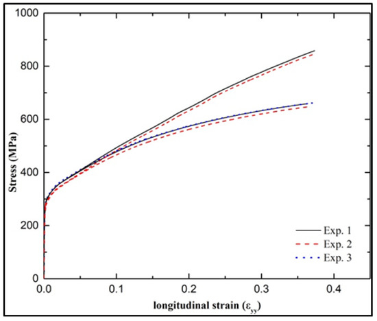 The validation of the stress–strain curve obtained from the tension test experiment is concerned with the numerical simulation in same rolling direction. The simulation was run in the same working conditions as were employed in the experiments. In the simulation, the calculation was performed by taking the centroidal node element and extracting the parameters of Cauchy stress and logarithmic strain value; these values were further compared with the DIC-obtained data. The experimentally obtained load value needed to be converted into Cauchy stress, as DIC gives logarithmic strain values.