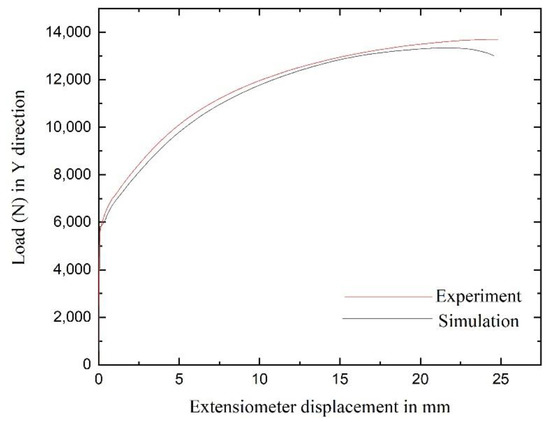 The comparison of the numerical simulation and the experimental values was plotted into a stress–strain curve, which shows an error of roughly 0.1% (see Figure 7).