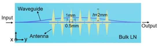 A variety of electric field sensors have been developed in past years. Traditional broadband electric field sensors are commercially available at present. The typical product is the series of Narda-NBM-550, whose operation frequency range is from 300 MHz to 50 GHz. Nevertheless, the output is a direct current (DC) voltage corresponding to the amplitude of the electric field, where the frequency domain and the time domain information of the signal are missing. D-dot type electric field sensors have been extensively studied in recent years because of their ability to achieve high-power sensing in the operation bandwidth up to 10 GHz [3,4,5,6]. However, the D-dot-type sensors generally have a large size up to tens of centimeters. As an alternative, photonic EMS sensors have been widely developed, which have both s small size and a relatively broad operation bandwidth [7,8,9,10]. The electric field sensor, based on electro-optic modulation by Pockels effect on lithium niobate (LN), is one kind of passive optical device without electromagnetic wave emission. This type also has a superior performance in operation bandwidth, sensitivity, dynamic range and linearity compared with the devices fabricated by using other materials. The modulated optical wave can propagate through a long optical fiber with ultra-low transmission loss and without electromagnetic interference, which is beneficial for achieving remote sensing with a high fidelity. Generally, the LN-based electric field sensor has a small size down to several centimeters. Due to the abundant design free degree of the waveguides and the antennas, a variety of LN-based electric field sensors are proposed for diverse electromagnetic sensing applications [11,12,13,14,15,16]. These works are mainly concentrated on the operation bandwidth and the sensitivity of the sensor. For example, the LN sensor based on a Mach–Zehnder interferometer, reached an operation frequency range of 10 kHz to 18 GHz [11]. The thin film LN sensor, based on a Michelson interferometer, realized a sensitivity of 8.45 mV/m/Hz−1/2 [16].