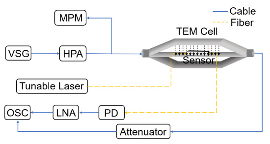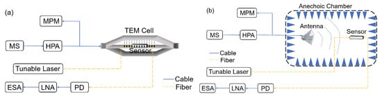 Frequency response measurement setup for the sensor chip based on (a) TEM cell and (b) anechoic chamber. MS: microwave source; HPA: high-power amplifier; MPM: microwave power meter; PD: photodetector; LNA: low-noise amplifier; ESA: electrical spectrum analyzer.