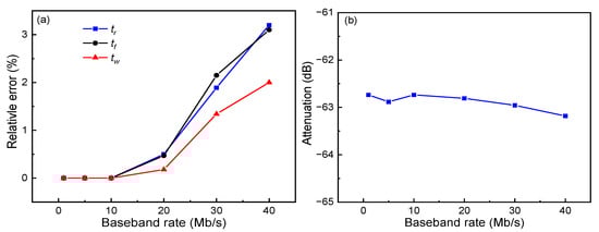 (a) Relative measurement error of tr, tf and tw under different baseband rates; (b) Measured signal power attenuation after the sensing system.