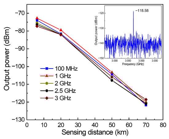 Remote sensing is also demonstrated based on the system shown in Figure 5a. In the experiment, the sensor chip is placed in the TEM cell. Single-tone microwave signals at 100 MHz, 1 GHz, 2 GHz, 2.5 GHz, and 3 GHz and with an identical amplitude of 40 V/m are generated in the TEM cell. Two spools of single-mode fiber are employed to connect the laser, the sensor chip and the PD. In order to guarantee that the measured signal comes from the sensor chip instead of the free space radiation from the TEM cell to the ESA, the TEM cell and the ESA are placed in two rooms, respectively. On this condition, the radiated signal power from the TEM cell to the ESA through free space is measured to be lower than the noise floor of the ESA, with a RBW of 1 Hz. Remote sensing is demonstrated, with distances of 6 km, 20 km, 50 km and 70 km. In the measurement, the RBW of the ESA is set to be 1 Hz, where the noise floor is measured to be −140 dBm. Figure 10 shows the measured signal power under different sensing distances. The signal power decreases as the sensing distance increases, as depicted in Figure 10. However, the SNR of the 70 km remote sensing at 3 GHz is still over 20 dB. In the remote sensing experiment, different spools of optical fiber are used to emulate different sensing distance. Table 1 lists the measured loss of the optical fibers used in the experiment. These fibers do not have an identical loss coefficient, i.e., 0.33 dB/km and 0.3 dB/km for the input and output of a 6 km-long fiber, 0.25 dB/km and 0.24 dB/km for the input and output of a 20 km-long fiber, 0.218 dB/km and 0.216 dB/km for the input and output of a 50 km-long fiber, and 0.23 dB/km and 0.225 dB/km for the input and output of a 70 km-long fiber. The degradation of the signal power with the increasing distance in Figure 10 is consistent with the optical loss of the fibers. Benefiting from the low insertion loss of the optical fiber, long-distance remote sensing, based on the proposed photonic electric field sensor chip, is feasible.