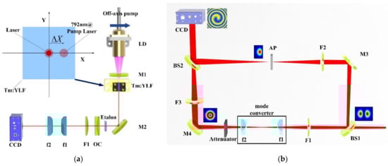 The experimental design of this paper is shown in Figure 1a. The resonator was L-shaped, wherein M1 (HT at 792 nm, HR at 1908 nm) was a plane mirror, M2 (45° HR at 1908 nm, 45° HT at 792 nm) was a plane mirror placed at 45° compared to M1, and OC (R = 300, transmittance = 5% at 1908 nm) was a concave output mirror. A fiber-coupled 792 nm LD (core = 200 μm, NA = 0.22) was used as the pump source. The pump laser was focused to the center of the Tm:YLF crystal (size: 3 × 3 × 14 mm3, Doping concentration: 3 at %) through two coupling lenses (focal length ratio = 25:50 mm). Two coupling lenses were located in a movable lens barrel, and off-axis pumping was realized by moving the lens barrel to control the position of the pumping laser. During the experiment, the crystal was placed in a heat sink connected to a water cooler to ensure that the temperature of the crystal did not exceed 20 °C. A piece of F-P etalon made of fused silica was inserted into the resonator for wavelength tuning. The thickness of the etalon was only 25 μm, and the free spectral range was 49.8 nm. The etalon was placed on a special mount that could be rotated and moved horizontally, and the wavelength was measured by a spectrometer (Yokogawa, AQ6375, Japan, 1200 nm–2400 nm). After the HG mode was generated by the off-axis pumping, the mode conversion requirements were met through the mode matching lens F1 (f = 60 mm). The HG mode satisfying the mode matching was converted into the corresponding LG mode through the mode converter. The mode converter consisted of two cylindrical lenses (f = 25 mm) placed at 45°, and the distance between the two cylindrical lenses was . The transverse modes were captured by a beam profiling camera (Spiricon, Pyrocam III, USA, 13 nm–355 nm and 1.06–3000 µm). The phase distribution of the vortex beam was verified by building a Mach–Zeder interference system. The experimental setup is shown in Figure 1b. BS1 and BS2 were beam splitter and beam combiner, respectively. F2 and F3 were used to control the size of the two beams. The relative intensity of the two beams was controlled by the attenuator. The interference pattern was captured by a beam profiling camera (Spiricon, Pyrocam III, USA, 13 nm–355 nm and 1.06–3000 µm).