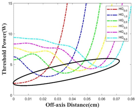 According to the formula, the threshold power vs. off-axis distance curves of six modes can be simulated, and the results are shown in Figure 2. It is known that the mode with the lowest threshold power tends to oscillate preferentially. According to Figure 2, it can be seen that the order of the lowest threshold mode gradually increased. Therefore, the whole tuning process should be a process of increasing the mode order. Furthermore, because of continuous mode change, the threshold power curve of the laser should be the same as the curve marked by the black circle in Figure 2. Moreover, the alternation between the mode curves started to become faster as the off-axis distance increased, which means an acceleration of mode changes.