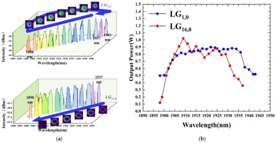 (a) Wavelength tuning of LG1,0 mode and LG16,0 mode. (b) Output power curve for different wavelengths.