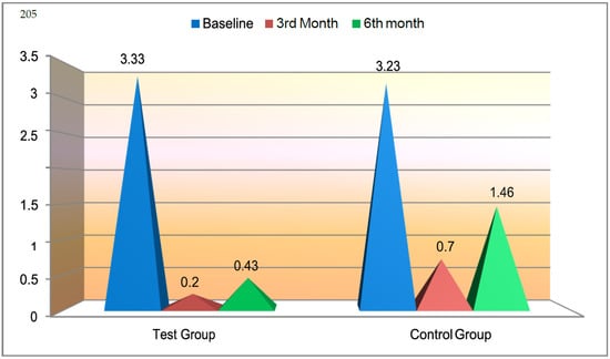 Inter- and intra-group comparison of recession depth was highly significant (p < 0.001) at all time intervals among the control and test groups. Details of the comparison are given in Figure 3 and Table 2.