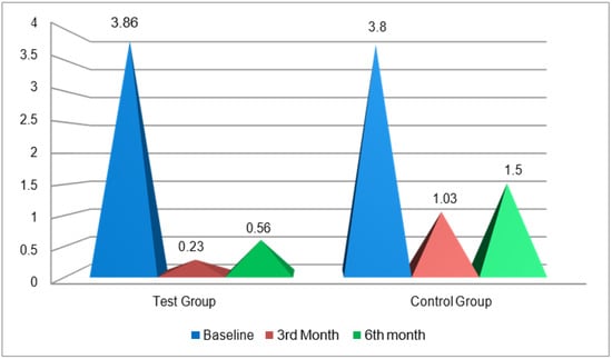 At baseline, the WHI score was 2, shown by 66.7% of patients in control sites and 20% of patients in test sites. The p-value between the two was 0.01, which was statistically significant. At 3 months and 6 months, there was no difference in wound healing for either the control groups or the test groups.