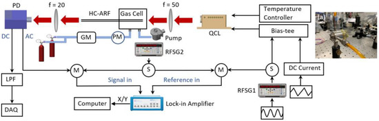 Figure 1 presents the experimental setup of the mid-infrared HC-ARF-coupled FMS. A continuous-wave QCL (AdTech Optics) can be tuned across the absorption line of NO centered at 1900.08 cm−1. The radio frequency modulation is achieved by the direct current modulation from RFSG1 (SG382, Stanford Research Systems) exerted from the AC port of a bias-tee circuit. The QCL current is also swept by a triangular waveform at 10 Hz to scan across the NO absorption profile. The custom-made tellurite HC-ARF is composed of a single layer of hollow capillaries, forming a hollow air core with a diameter of 130 µm, and has a total length of 35 cm. The QCL beam is coupled to the HC-ARF by an AR-coated CaF2 plano-convex lens (focal length of 50 mm) with the HE11 mode transmission. One end of the HC-ARF used in this study is fixed inside a gas cell with high compactness for gas introduction into the fiber, as indicated in the inset graph (a) of Figure 1. More details of the HC-ARF gas cell can be found in our recent work [27].