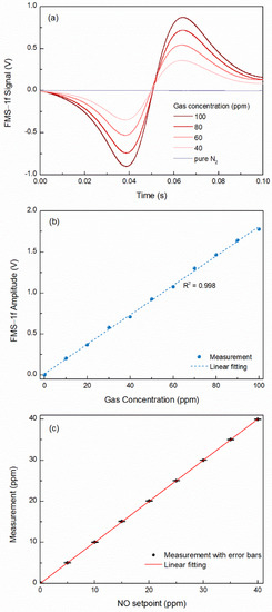To evaluate the performance of the FMS measurement in the mid-infrared HC-ARF, the sensor response is examined under varied NO concentrations. Figure 4a depicts the representative FMS-1f signals for various NO mixtures. The background signal of pure N2 is also shown in the same figure with a 1σ of 1.2 mV. According to the linear response (17.8 mV/ppm, R-square 0.998) of the sensor over the concentration range of 0–100 ppm, as shown in Figure 4b, the HC-ARF-coupled FMS sensor shows an NEC of 67 ppb or a noise equivalent absorption (NEA) coefficient of 1.2 × 10−6 cm−1. In order to evaluate the repeatability of the gas sensor, three groups of measurements are conducted from 5 to 40 ppm with an interval of 5 ppm, as indicated in Figure 4c. The error bars represent the standard deviation with a maximal uncertainty of 0.8%.