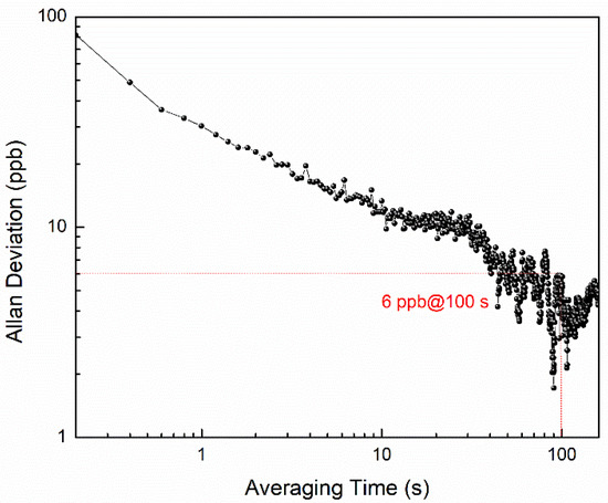 The long-term stability of the FMS sensor is evaluated by performing the Allan-Werle deviation analysis with pure N2 flowing through the HC-ARF. By locking the laser wavelength to the absorption line center of NO, the signal of pure N2 is continuously measured for 20 min with the acquisition rate of 10 Hz. An improved NEC of 6 ppb is observed at an averaging time of 100 s, as shown in Figure 5, corresponding to an NEA coefficient of 1.0 × 10−7 cm−1. The sensitivity of the current FMS sensor is mainly limited by the short length of the tellurite HC-ARF and the possible fringe noise.
