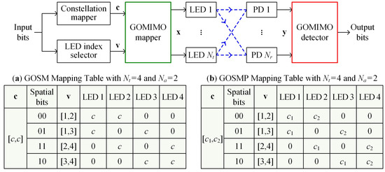 As a very natural way to efficiently improve the achievable capacity of indoor OWC systems that use LEDs, multiple-input multiple-output (MIMO) transmission has attracted great attention recently, which fully exploits the existing LED fixtures in the ceiling of a typical room to harvest substantial diversity or multiplexing gain [7,8,9]. So far, various optical MIMO techniques have been introduced for OWC systems, among which optical spatial multiplexing (OSMP) and optical spatial modulation (OSM) are two of the most popular. Specifically, OSMP can achieve a full multiplexing gain and hence a relative high spectral efficiency, but suffers from severe interchannel interference (ICI) [10]. In contrast, OSM can remove ICI by activating a single LED to transmit signal at each time slot. Although OSM can transmit additional index bits, only one constellation symbol can be transmitted at each time slot, and hence it is challenging for OSM systems to achieve high spectral efficiency [11]. Lately, generalized optical MIMO (GOMIMO) techniques, including generalized OSM (GOSM) and generalized OSMP (GOSMP), have been further proposed to boost the capacity of MIMO-OWC systems [12,13,14,15]. In GOSM systems, multiple LEDs are activated to transmit the same signal, and therefore more index bits can be transmitted and the diversity gain can also be increased. In GOSMP systems, only a subset of LEDs are activated to transmit different signals, resulting in reduced multiplexing gain. However, additional index bits can be transmitted, and the ICI can also been reduced in GOSMP systems.